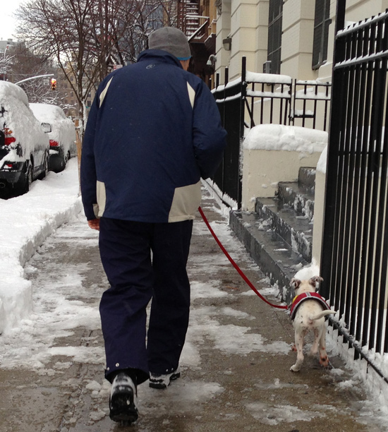 Up a flight is Duke, a rescue adopted 7 years ago when his 83 y.o. owner became widowed. Duke vacuums the streets while walking and yesterday scored a bagel, a slice of pizza and a mitten. He also knows what doormen give out treats and when his owner takes him swimming in a hotel in Tribeca Duke drags her doorman to doorman as they make their way to the pool.
