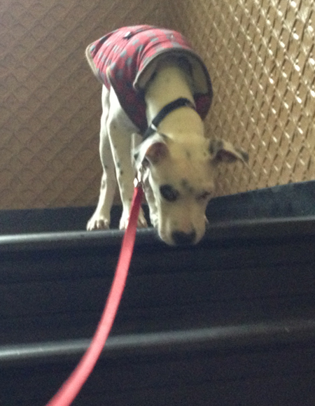 Our floor has Opal's other favorite dog, Bowser, a Boxer/mutt blend who is also a rescue. Before Bowser and owner moved in the apartment was a brothel, or where pros would take their clients. This arrangement was short lived since within a month the whole building knew what was up with the 6 ft. glamour girls and their 5 ft. dates and someone complained. Like the tenants before them, they disappeared overnight.