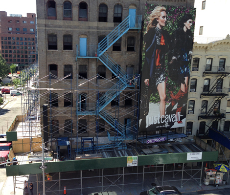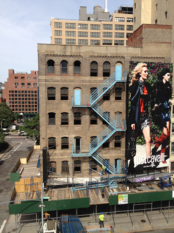 To the left of the scaffolding, the red brick building with what looks like a grid of windows on its facade is brand new. As is everything on that block to the right of it. And to the left, though you can't see either of these directions because of new construction.