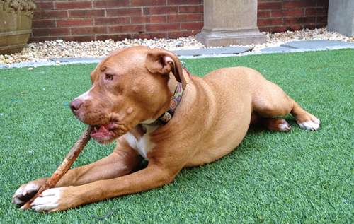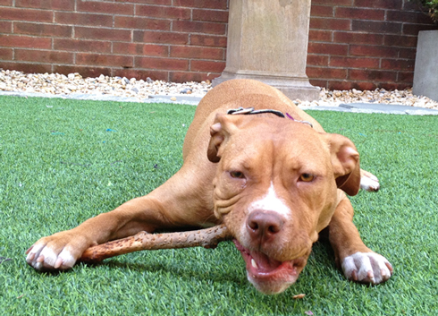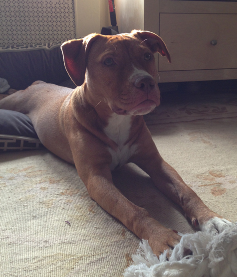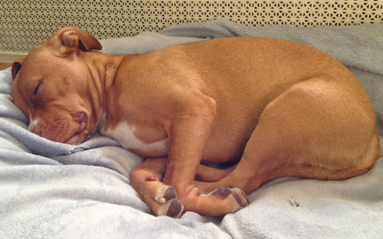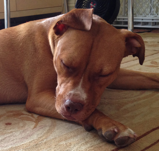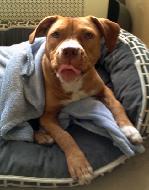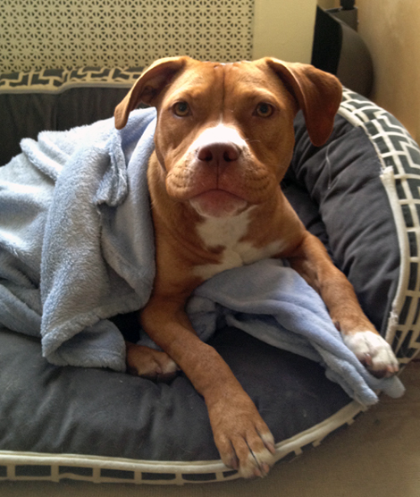 It's so calming to look at I started drifting off, then I saw Ginger bolt through the living room with Joe behind her. Seconds later she bolted the other way with him at her heels. I closed my eyes and suddenly heard a pit bull at a full gallop barreling toward me. An instant later I felt paws and a wet nose on my head—Ginger had leapt into bed. She was scrambling for Joe's side of it just as he tackled her.