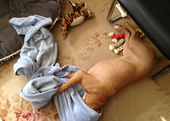 I rolled away from her stare, not wanting to budge. I could feel her beady eyes on the back of my head and she knew it; she attacked her bed and the carpet, knowing one of us would tell her to knock it off. Joe came in to do that and she happily followed him into the kitchen, now that she had gotten attention.