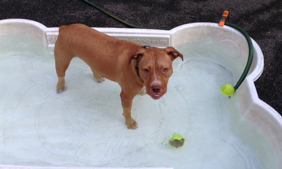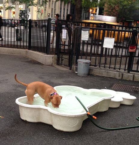 Fifteen minutes later she's on her feet, dragging her bed around the living room. We feed her and by 6:15 one of us (usually Joe) takes her down. We either take her to the river for a nice walk and to a dog run there, or to a run we're members of. She chases a ball, catches it and brings it back, catches it and brings it back. Every four or five catches she jumps in the pool and gums the ball while she splashes around. Then she brings it to us to throw again.