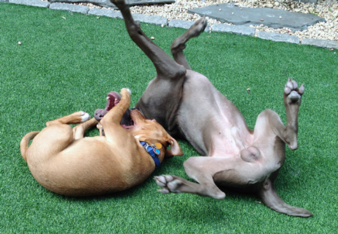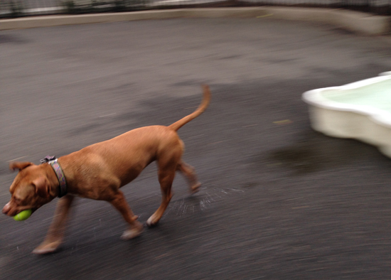 Chaos can break out at the dog run and she'll ignore it if we're throwing a ball. Her best friends come lomping onto the run and if she's chasing, she doesn't care. She'll go until she drops, so we'll end it long before she's ready to. Or we'll end it if we want her to play. She's a thief so we have to watch her with toys that aren't hers, but one of the runs supplies piles of balls so if another dog intercepts hers there's always another close by. Early mornings we get into a throwing and chasing rhythm that's a kind of meditation. It's a great way to start the day.