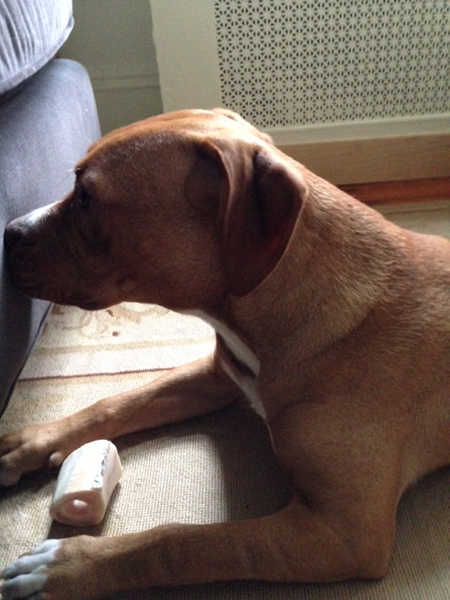 The other habit I'm looking forward to her growing out of is her 5 a.m. wake-up. She doesn't want to go out, she just needs reassurance we're still there. I'll flop an arm over the bed and pat her head and she'll curl up and go back to sleep, with my hand if I'll let her. This dog is a real toucher: when I take her downstairs she'll often have her nose in my knee; she sits on my feet or leans against me when we're outside; she sleeps under Joe's feet when he's working and under mine when he's out; and at night if we're on the couch streaming something she'll curl up around his foot or wrap her paws around his ankle. She's quirky in how insecure she is and how bold, but maybe we're all that way.