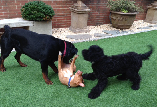 Pico is a Portuguese Water Dog about her age and tomorrow will be their last romp, at least for now. Pico is moving to California and will be missed as much by Ginger as me. He's a kook of a dog, all paws and limbs and goofiness, and Ginger loves getting nutty with him since he plays as hard as she does.